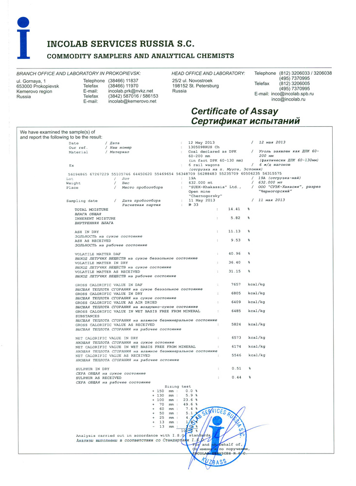 Уголь с горно-обогатительного комбината сертификат качества