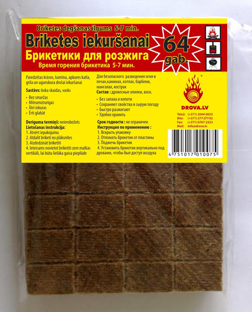 Преимущества : Минимальная цена одного розжига или растопки (стоимость одного брикетика 0.01 Eur)Легко и быстро дают эффект розжига Поджигаются обычной спичкой или зажигалкой Без запаха и копоти во время горения Сохраняют свойства в сырую погоду Исключен ожог рук и тела воспламеняющимися парами, ввиду их отсутствия, особенно если рядом дети Удобно возить с собой в машине Компактно хранятся, срок годности - не ограничен. Не требуется сертификация Нельзя использовать для приготовления пищи Примечание: Брикетик дольше горит в вертикальном положении |